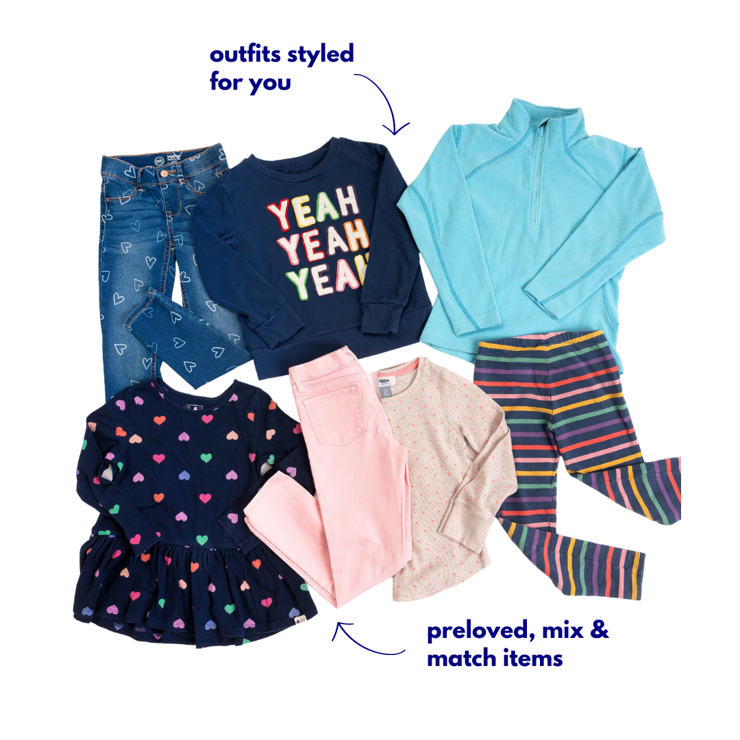 Share you kid's style, size, and gender with us. We'll send you 7 pieces styled just for them. No subscription required (but one available if you want to save more!)